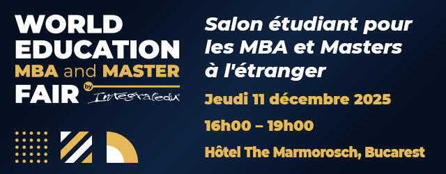 Si vous êtes un établissement d'enseignement supérieur promouvant ses programmes Master ou MBA ou bien un(e) étudiant(e) roumain(e) motivé(e), recherchant activement des opportunités de Master en France, ce salon de recrutement sur mesure, conçu spécifiquement pour les programmes de Master et de MBA, est fait pour vous !